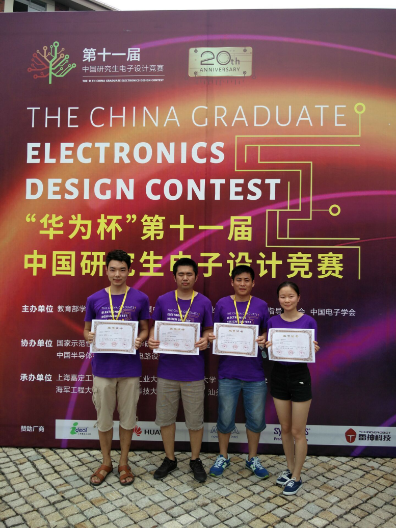 2016年8月17-20日,由教育部学位与研究生教育发展中心、全国工程专业学位研究生教育指导委员会、中国电子学会联合主办,面向全国高等院校及科研院所在读研究生的一项团体性电子设计创意实践活动,多所知名高校和上海嘉定工业区联合承办的“华为杯”第十一届中国研究生电子设计竞赛决赛在上海嘉定工业区隆重举行。本次全国总决赛共有从七大赛区1300余只参赛队中脱颖而出的317支参赛队伍同台竞技,共展风采。我校电子工程学院共有2件作品以华南赛区一等奖的成绩入围决赛,最终获得一个二等奖和一个三等奖。同时,欧纯阳获优秀个人三等奖。