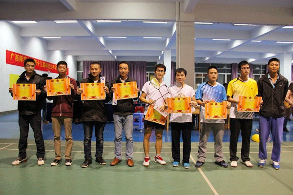 我院研究生在育才校区的预选赛中团结协作、表现优异,杀入决赛。于11月30日奔赴雁山校区参加决赛,表现突出,取得骄人战果:杨振、苏荣维在决赛中展现拼搏精神,以2:0取胜,获得羽毛球男子双打冠军;钟海鑫获得乒乓球男子单打季军;李俊毅、李可获得乒乓球男子双打季军。