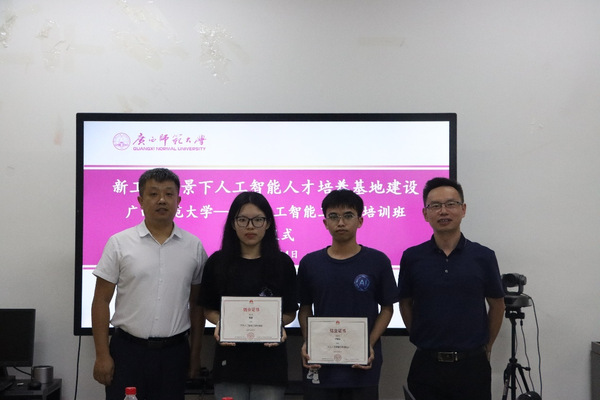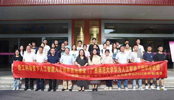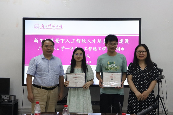 中国—东盟(华为)人工智能创新中心补贴项目“新工科背景下人工智能人才培养基地建设”子项目“广西师范大学华为人工智能工程师培训班”30余名学员经过5天的集中培训,全部通过结业考试,于7月14日下午顺利结业。桂林市信息中心、学校教务处相关负责人,电子与信息工程学院主要负责人出席结业仪式并讲话。电子与信息工程学院相关负责人主持仪式。中国—东盟(华为)人工智能创新中心区域经理、华为技术有限公司培训讲师,电子与信息工程学院教师代表,以及包括东盟国家留学生学员代表在内的学员参加结业仪式。