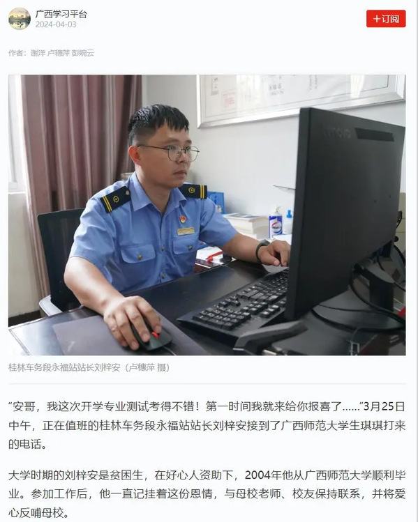 “安哥,我这次开学专业测试考得不错!第一时间我就来给你报喜了……”3月25日中午,正在值班的桂林车务段永福站站长刘梓安接到了广西师范大学生琪琪打来的电话。