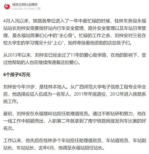 刘梓安校友2004年从我校电子与信息工程学院/集成电路学院电子信息工程专业毕业,毕业后选择应征入伍成为一名军人,2011年年底退役,2012年进入铁路系统工作。在永福矮岭站担任助理值班员。通过不断钻研和努力,他在一线工作中脱颖而出,入职第二年就拿到了南宁铁路局接发列车比赛的好名次。工作以来,他先后在桂林多个车站担任助理值班员、车站值班员、车站副站长、车站站长,2023年6月,他调至永福站担任站长。从2013年以来,刘梓安校友已经走过了11年的爱心助学路,在他的影响下,受过他帮助的人也在继续传递着这份爱心。