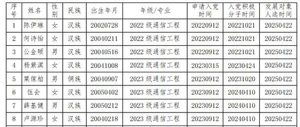 经支部委员会研究同意,将陈伊琳等8名同志列为发展对象人选。根据发展党员工作有关要求,现将其有关情况公示如下:
