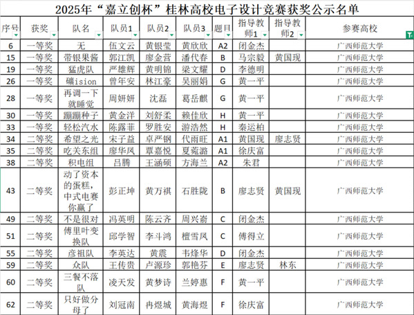 近日,2025年“嘉立创杯”桂林高校电子设计竞赛终评在南宁理工学院(桂林校区)圆满落幕。由徐庆富老师带领的17支代表队表现出色,共斩荣获一等奖7项、二等奖10项,创学校近年来最好成绩。