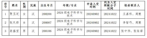 经党支部培养教育和考察,贾玉芝等3名同志已基本具备党员条件,在征求培养联系人、党员和群众意见的基础上,经支部委员会2025年11月11日讨论同意将贾玉芝等3名同志列为发展对象人选。