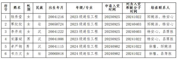 经支部委员会研究同意,将陆秀莹等6名同志列为发展对象人选。根据发展党员工作有关要求,现将其有关情况公示如下: