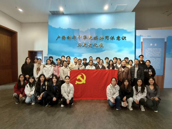 师生集中参观了“广西铸牢中华民族共同体意识历史文化展”。展厅内的文物实物、图片史料、场景复原等展品,系统呈现了广西各民族在漫长历史进程中的发展脉络。从古代各族先民共同开发岭南大地,到近代携手抵御外侮、守护家国,再到当代同心协力建设美好家园,一幅幅生动的历史画面,让党员们深刻认识到广西各族人民与全国人民一道,在开拓辽阔疆域、缔造统一多民族国家、书写悠久历史、创造灿烂文化、培育伟大民族精神等方面作出的不可磨灭的贡献,真切体会到“中华民族共同体”的深刻内涵。