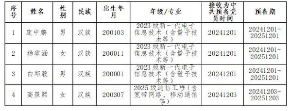 在征求党小组和党员、群众意见的基础上,经支部委员会审查,拟将庞中鹏等4名同志转为中共正式党员。根据发展党员工作有关要求,现将其有关情况公示如下:
