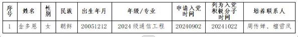 经党支部培养教育和考察,金多恩同志已基本具备党员条件,在征求培养联系人、党员和群众意见的基础上,经支部委员会2025年12月2日讨论同意将金多恩同志列为发展对象人选。