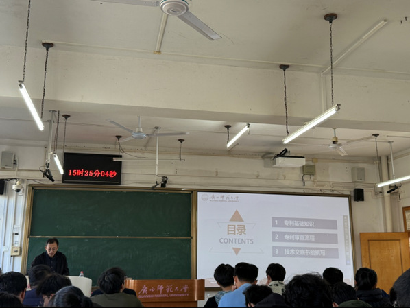 杨军老师先介绍了专利的基础知识,包括由来、分类和三性(实用性、新颖性、创造性),然后介绍了专利的审查流程,最后重点讲解了技术交底书的撰写,举例说明了研究生申请专利和发小论文的顺序及时间节点。