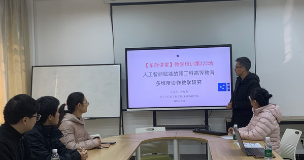 人工智能与教育的融合已成为当前教育领域的重要发展趋势,尤其在新工科教育协作学习方面展现出巨大潜力。为积极响应新工科建设需求,探索将人工智能技术应用于新工科高等教育,为多维度协作教学提供高效的技术支撑,2025年12月26日上午,由广西师范大学教师教学发展中心主办,广西师范大学电子与信息工程学院/集成电路学院人工智能教研室承办的“东莼讲堂”教学培训活动——“人工智能赋能的新工科教育多维度协作教学研究”,在育才校区电子楼414顺利举行。本次活动吸引了学院人工智能课程相关的全体教师、相关专业学生,以及对人工智能在理工科课程应用感兴趣的师生参与。