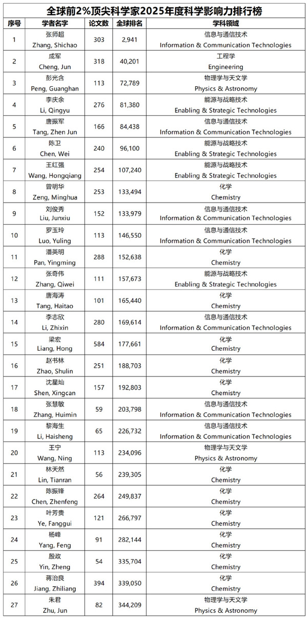 据悉,全球前2%顶尖科学家榜单分为“终身科学影响力排行榜(Career-long Impact)”和“年度科学影响力排行榜(Single-year Impact)”两大部分,从全球近700万名科学家中,通过基于其论文引用数、h因子、合著者修正的hm因子、单独或第一作者的文章引用数等综合参数,遴选出世界排名前2%的科学家,涵盖22个领域和174个子领域。其中,“终身影响力”榜单统计科学家职业生涯期间的综合表现,“年度影响力”榜单则聚焦上一年度的学术影响力。
