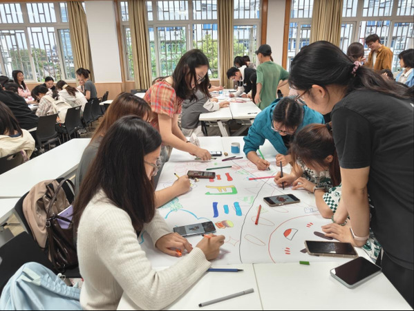 绘画结束后,各小组展示画作、分享创作思路,少数民族党员主动分享本民族文化,讲述铜鼓象征意义、瑶族长鼓舞起源、山歌对唱习俗等内容,现场互动热烈、掌声不断。
